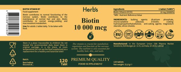 - How to use For adults take 1 capsule per day with meal. Ingredients for 1 tablet Biotin (vitamin B7/H) (10 mg)