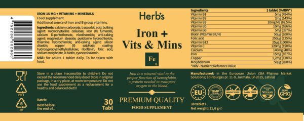 - How to use For adults take 1 tablet per day with meal. Ingredients for 1 tablet Vitamin B1 (5 mg) Vitamin B2 (2 mg) Vitamin B3 (10 mg NE) Vitamin B5 (10 mg) Vitamin B6 (5 mg) Biotin (vitamin B7/H) (50 ยตg) Folic acid (250 ยตg) Vitamin B12 (25 ยตg) Vitamin C (120 mg) Calcium (140 mg) Iron (15 mg)…