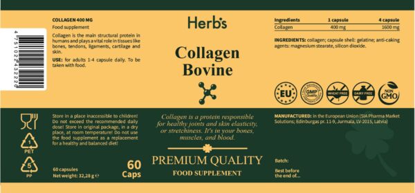 - How to use For adults take 1-4 capsules per day with meal. Ingredients for 1 capsule (400 mg) Collagen (400 mg)
